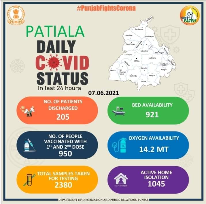 #Patiala daily #covid status in last 24 hours dt 7-6-2021 #PunjabFightsCorona #MissionFateh #Oxygen #covidbeds #ActiveHomeIsolation #COVIDVaccination #PatientsDischarged #SamplesTakenForTesting