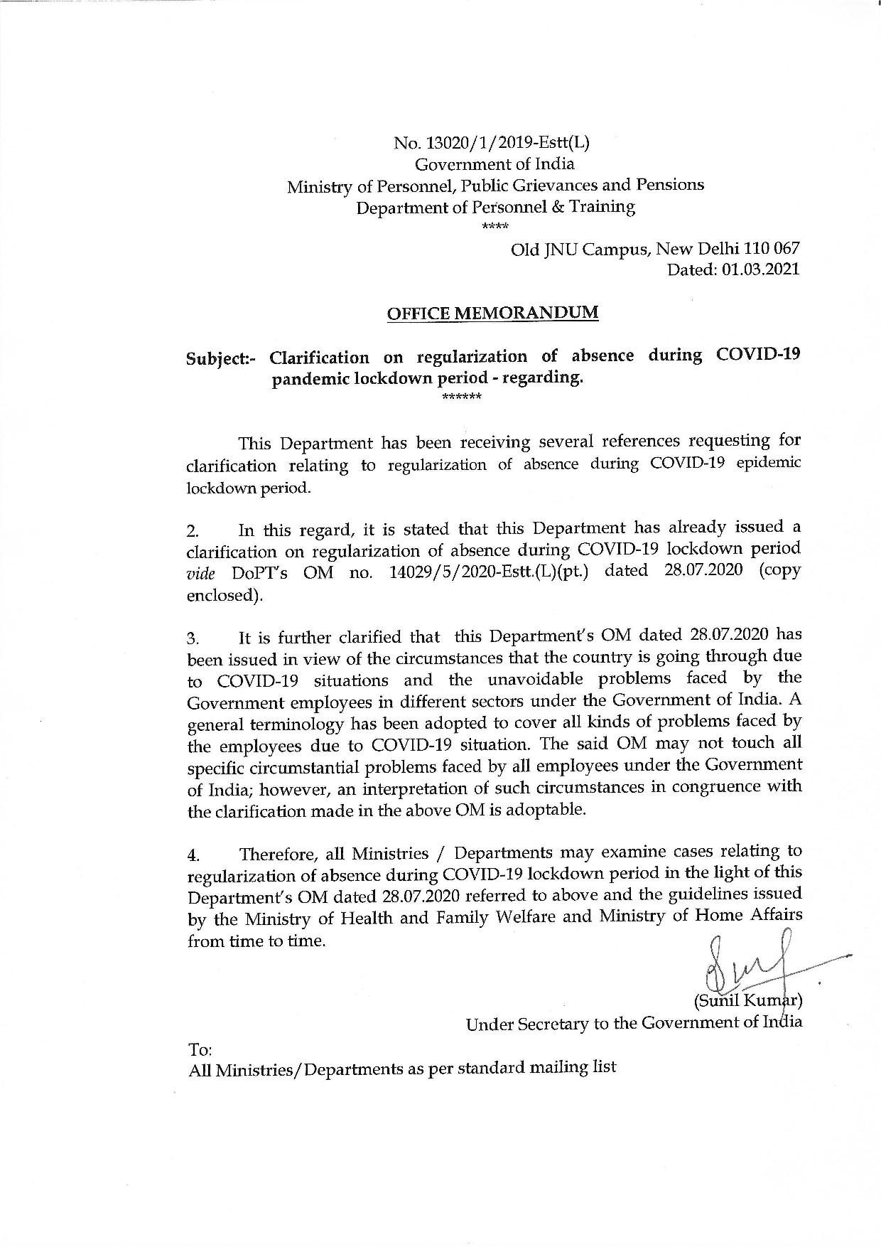 Ministry of Personnel Public grievances and pensions has clarified on the treatement or hospitalization or quarantine period leave during covid 19 pandemic