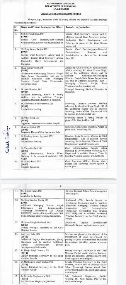 The Punjab Government has ordered the transfers and postings of the 12 IAS and 5 PCS officers with immediate effects.