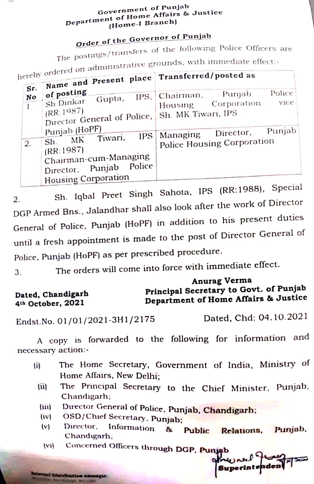 Ex DGP Punjab Dinkar Gupta Transferred, 2 Senior IPS Transferred: News Punjab